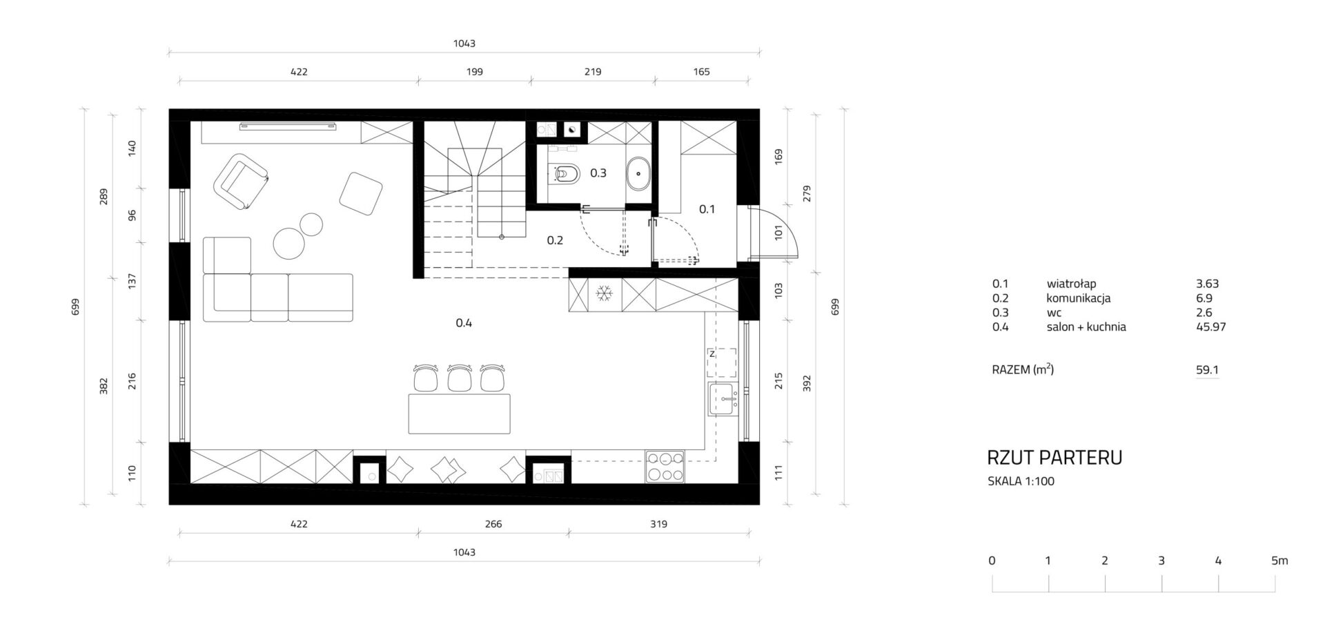 Rzut wnętrza z aranżacją pomieszczeń – przedstawia optymalny układ funkcjonalny, czyli rozmieszczenie mebli, sprzętów i innych elementów wyposażenia.